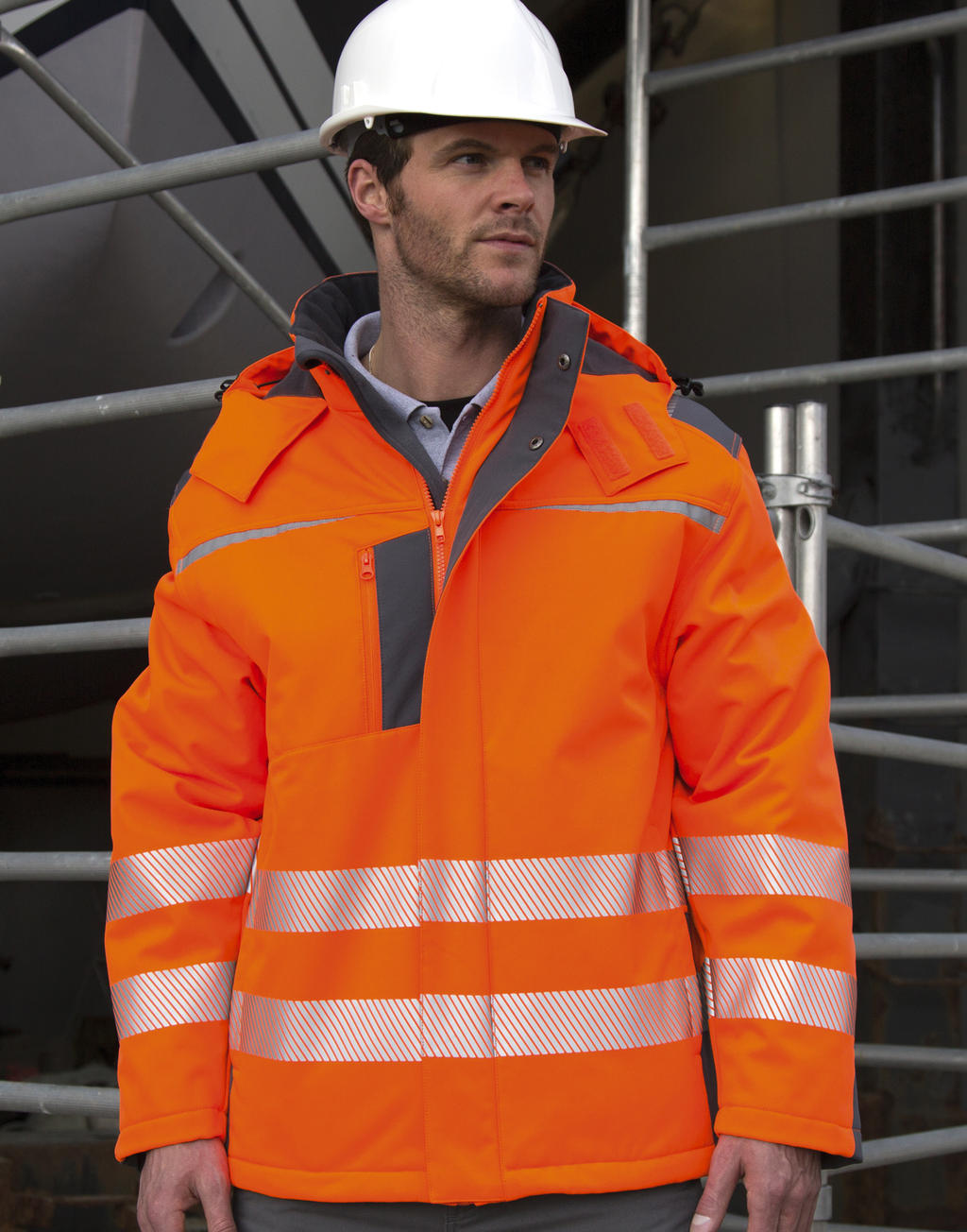 Detalles | Alta visibilidad, Bolsillo interior, Bolsillos laterales con cremallera, Con capucha, Cremallera Entera, Manga montada |